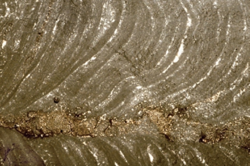 A well developed ancient example of a laminated and contorted stromatolite (loferite). The dark reddish-brown color (refl ecting signifi cant preservation of organic matter), slightly pelletal texture, irregular lamination, and elongate (“birdseye” or fenestral) pores are characteristic of stromatolites, but are not always this clearly displayed. Although the stromatolite fabric most likely represents growth and sediment trapping in and on a microbial mat, no microbes were recognizable in this deposit (as in most such stromatolites). Figue below